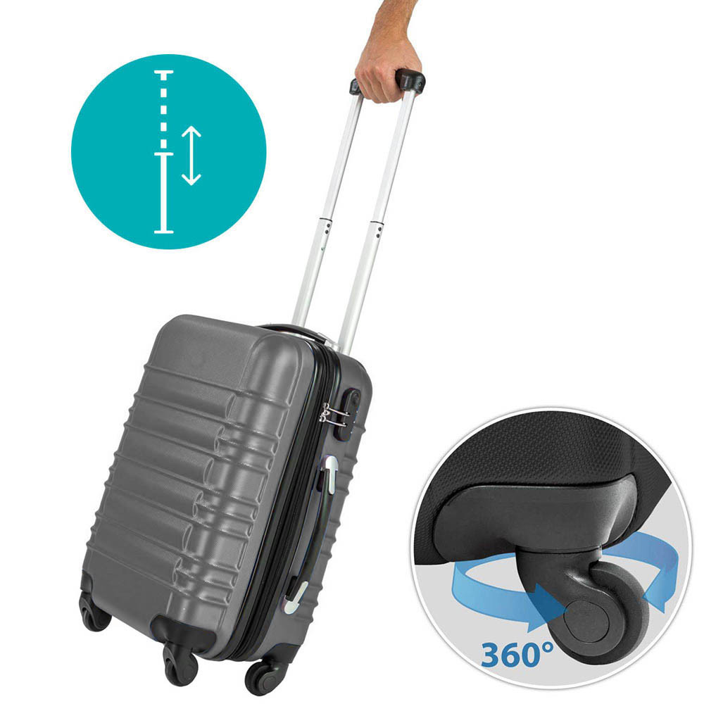 A 4 irányba forgó kerék bármilyen terepen megkönnyíti a közlekedést, még zsúfolt helyeken is. A teleszkópos nyél két állásban használható, így mindenki számára kényelmes fogást biztosít, akár húzod, akár tolod a bőröndöt.