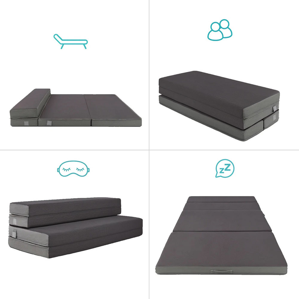 A 10 cm vastag poliuretán hab réteg kiváló alátámasztást nyújt, akár fekvésre, akár ülésre használod. Összehajtva kanapéként vagy háttámlás ülőhelyként is funkcionál, így igazán sokoldalú darab.