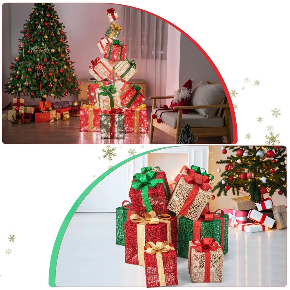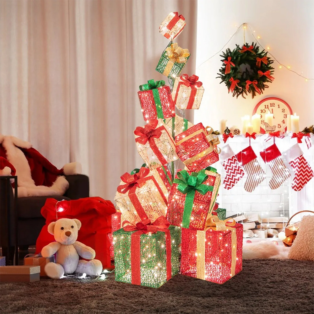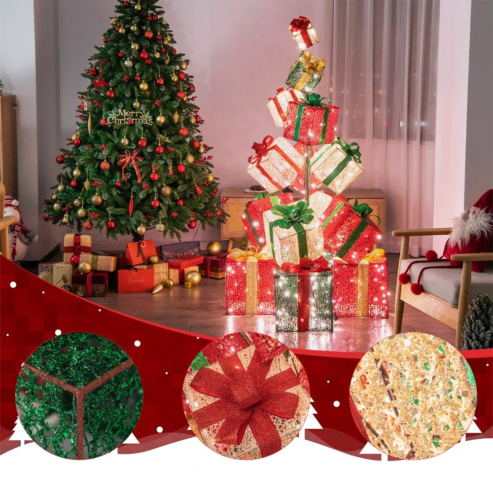 Részletes útmutatóval és előre elkészített elemekkel egyszerűen felépíthető. A dobozokat csillogó szövet és élénk szalagok díszítik, így minden ünnepi környezetben stílusos és figyelemfelkeltő megjelenést biztosítanak.