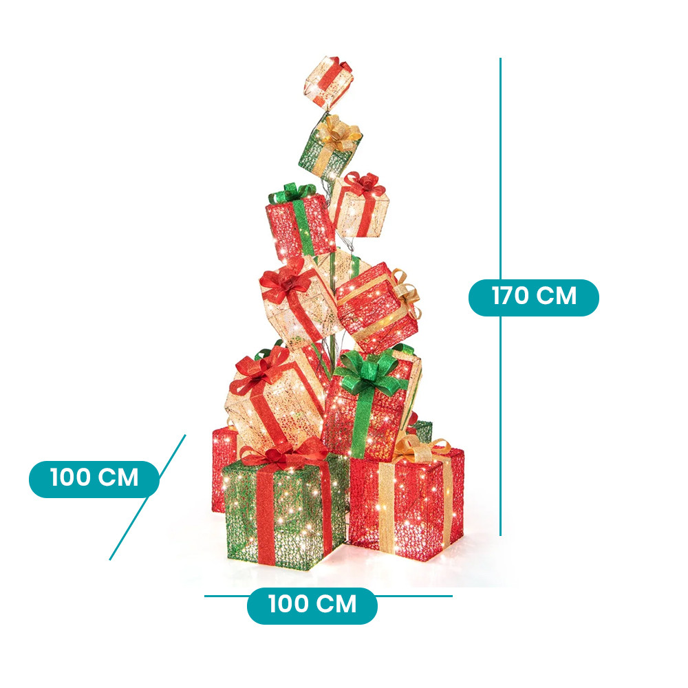 Ez az ünnepi dekoráció 15 színes, masnival díszített ajándékdobozból áll, amelyek önállóan vagy egymásra építve is használhatók. A 450 darab melegfehér LED fény varázslatos ragyogást biztosít, amely nappal is csillogó, este pedig hangulatos fényponttá válik otthonodban vagy kertedben.
